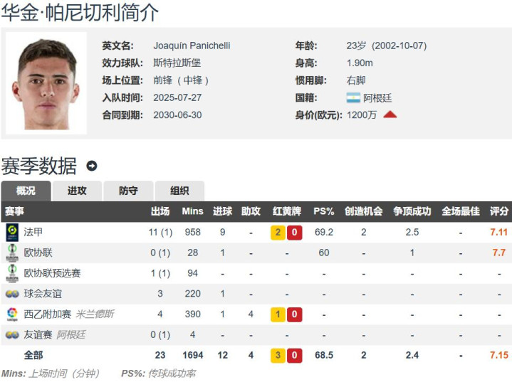 帕尼切利出自河床青训,球员于今年夏窗以1650万欧元的转会费从阿拉维斯加盟斯特拉斯堡,并立马成为球队主力中锋,发挥非常出色,出战了本赛季全部的12场法甲的比赛,其中11次首发,合计出场958分钟,打入了惊人的9个进球,目前领跑法甲射手榜。